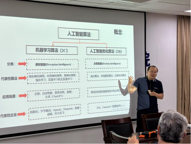 讲座中,秦虎教授首先深入剖析了人工智能的两大核心能力——感知智能与决策智能。感知智能主要依靠机器学习算法,在图像识别、语音识别、推荐系统等领域有着广泛的应用,凭借其卓越的数据处理与模式识别能力,为各行业带来了变革。决策智能则以运筹优化与智能搜索算法为支撑,通过建模和计算寻优,有效解决了物流调度、供应链管理和生产计划等复杂决策问题。秦教授结合实际案例,深入浅出地阐释了这两类智能的基本概念、技术特征以及在不同应用场景中的优势,为在场师生勾勒出人工智能技术的全貌,让大家清晰地理解其系统能力和应用价值。