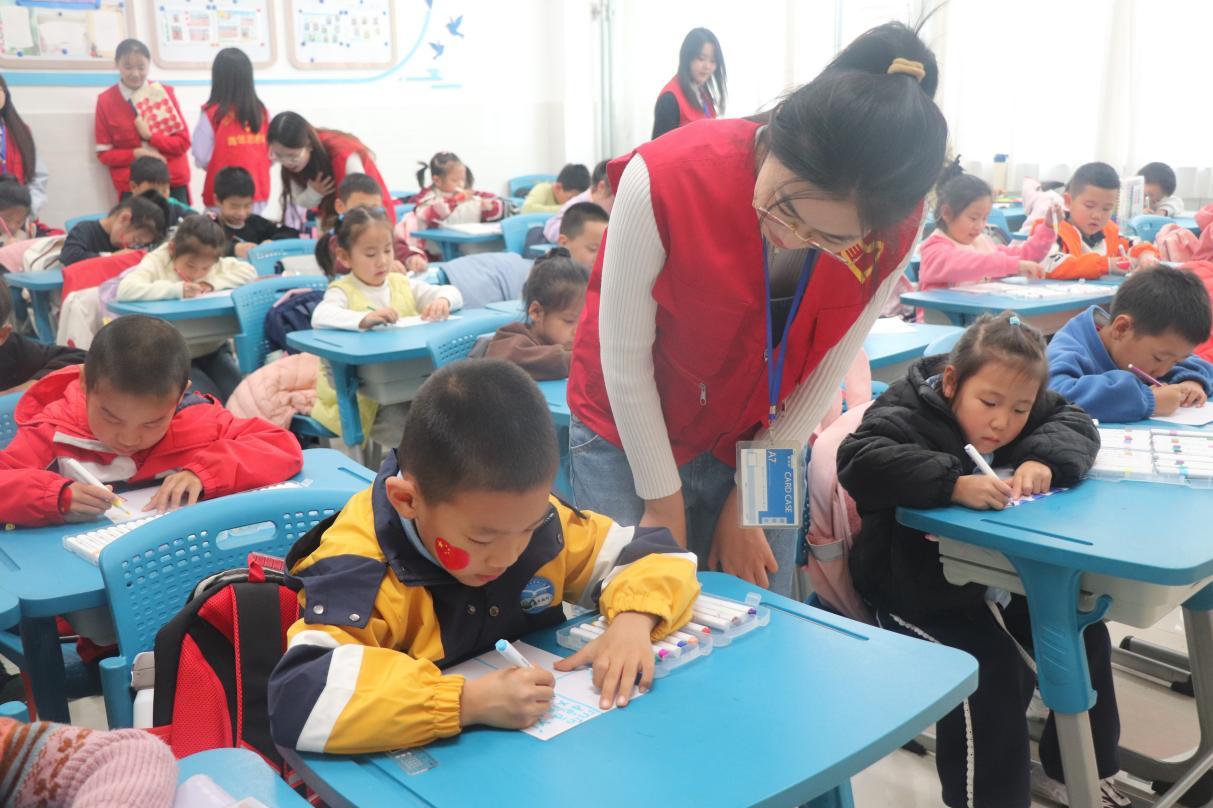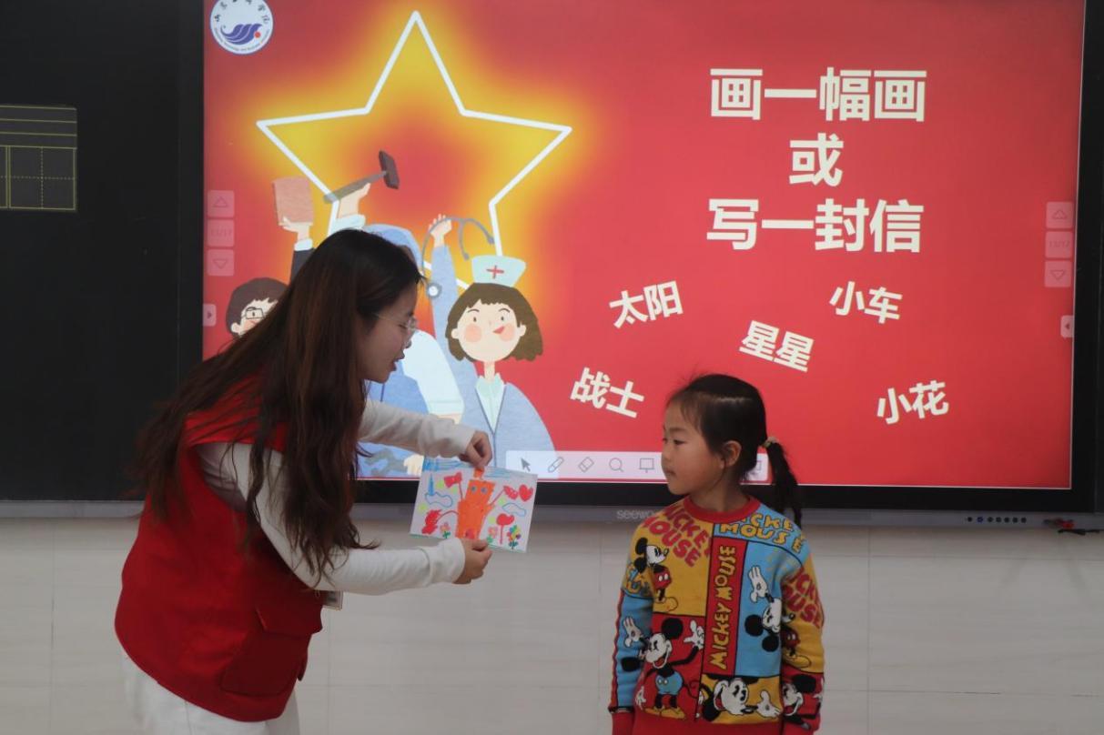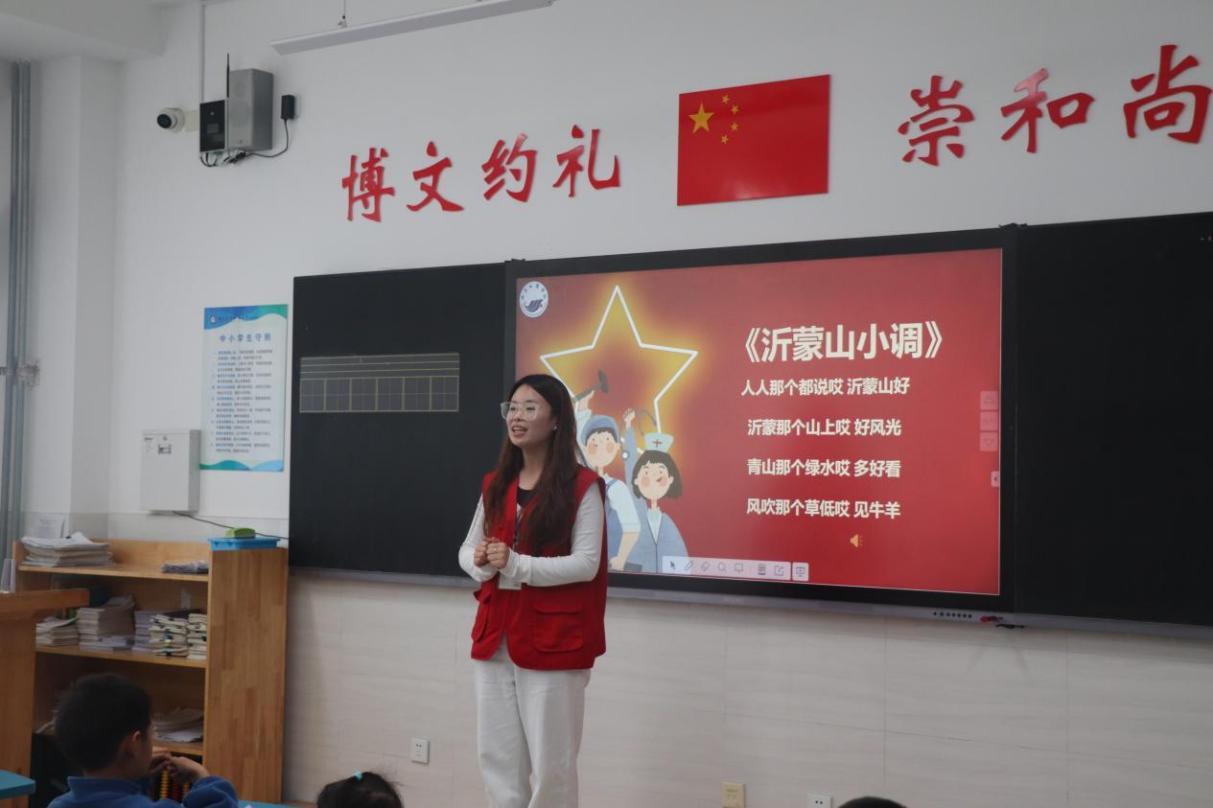 在最后的课堂互动中,志愿者为孩子们发放画纸,鼓励他们描绘心中的沂蒙山美景或好人好事。孩子们纷纷拿起画笔,发挥想象,用绚丽的色彩和纯真的笔触勾勒出对沂蒙精神的理解与向往。随后,部分同学上台展示作品,志愿者给予了高度评价和鼓励。此外,志愿者还教孩子们演唱《沂蒙山小调》,并加入简单手势,让孩子们在悠扬歌声中进一步体悟沂蒙精神的独特魅力。