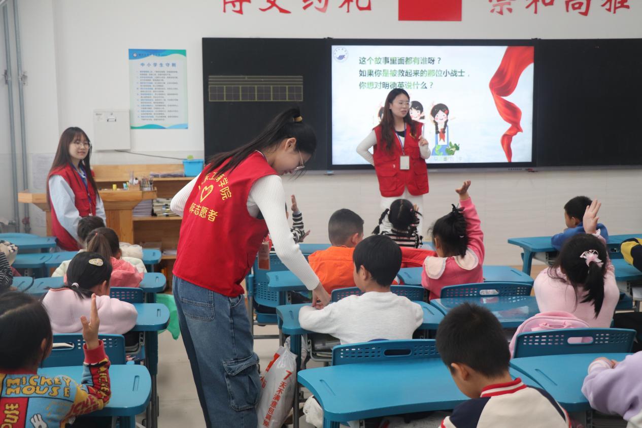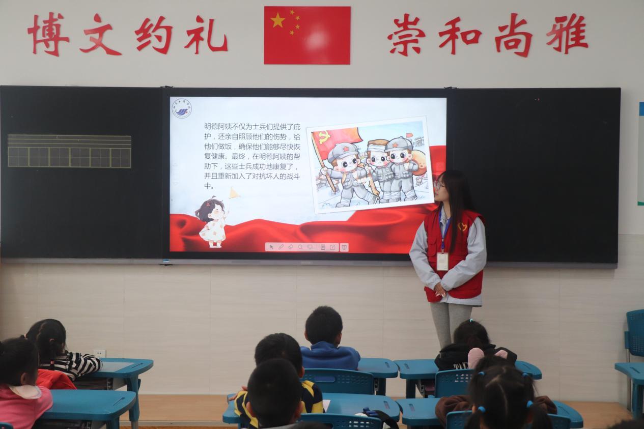 宣讲环节,志愿者借助精心制作的PPT,通过讲述生动故事、展示感人图片等形式,深入阐释沂蒙精神的深刻内涵。其中,“沂蒙红嫂明德英” 的故事更是打动人心。志愿者以简洁生动的语言和形象具体的事例,将明德英救助伤员的英勇事迹娓娓道来,让孩子们深刻感受到沂蒙精神的磅礴力量。问答环节中,“故事里都有谁呀?” 等简单有趣的问题激发了孩子们的兴趣,答对的孩子还获得了小贴纸奖励,现场气氛热闹非凡。