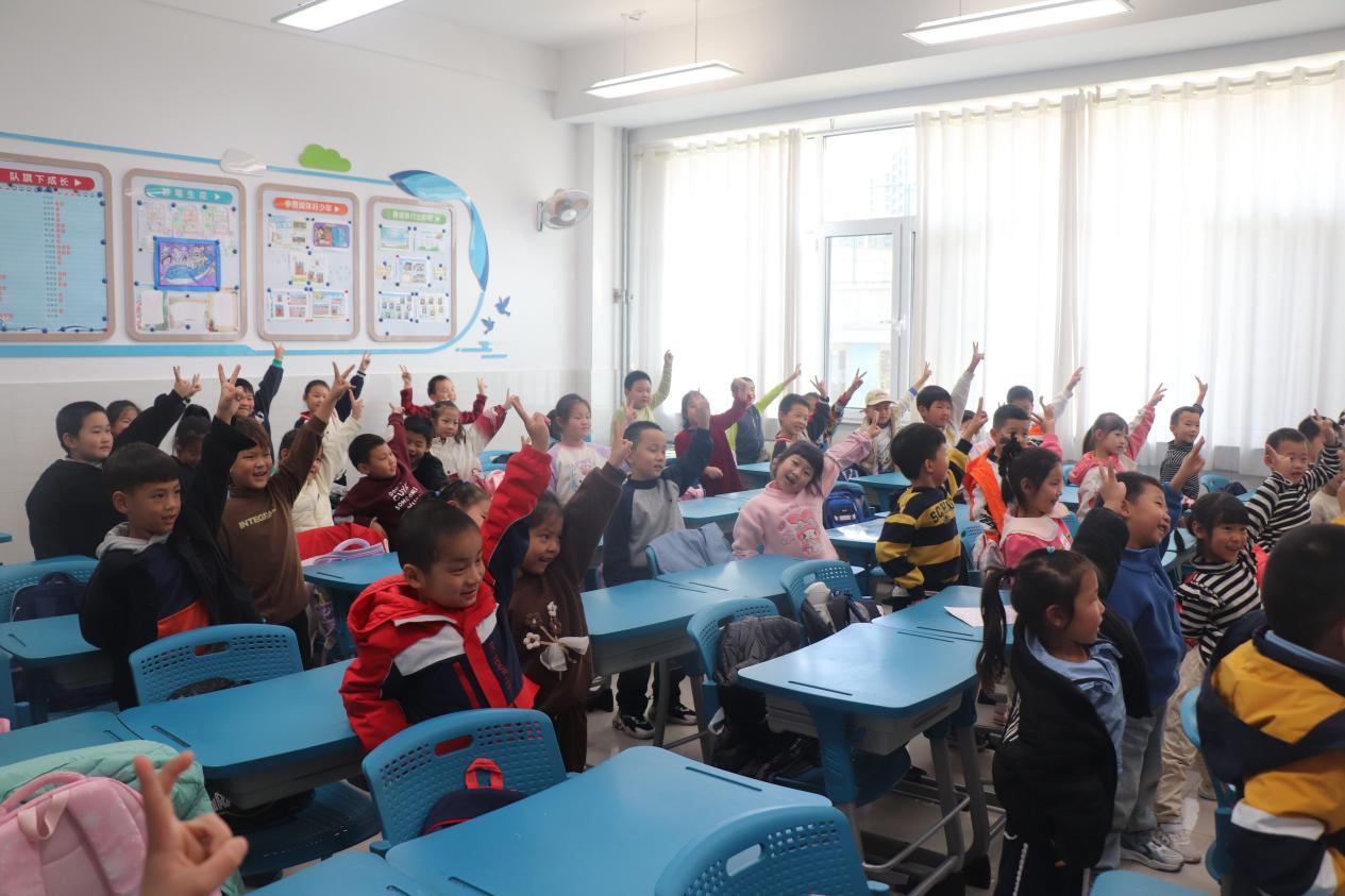 为迅速活跃气氛,志愿者们精心准备了“照镜子” 热身游戏。从简单的挥手、跳跃,到比心、冲锋等动作,游戏难度逐步递增。孩子们积极参与,课堂瞬间充满欢声笑语,志愿者们的热情与活力也在互动中传递给了每一个孩子。