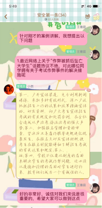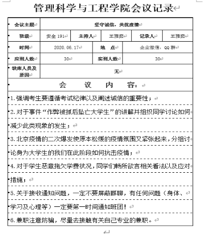 本次活动,主要讲述诚信教育问题,会议主讲人根据《tyc5997太阳集团2019-2020诚信考试承诺书》强调考生诚信考试的重要性。同时,再一次提醒学生疫情期间不能放松警惕,时刻注意防护安全。此外,针对借贷不还、恶意拖欠学费、学术不端等不良现象进行讨论交流,提醒学生兼职注意防骗,坚决维护好自身利益。