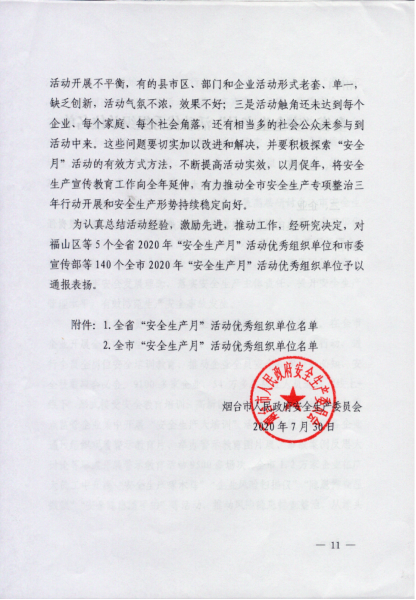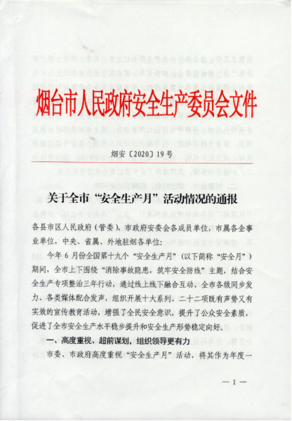 7月20日,烟台市人民政府安全生产委员会就全市“安全生产月”活动情况进行通报,我校获全市“安全生产月”活动优秀组织单位。(作者:郑彬彬 审核:冯述虎)