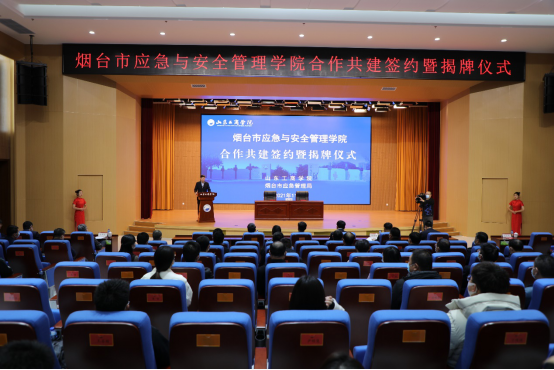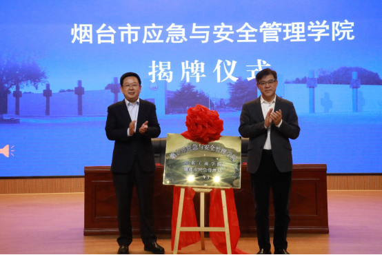 杨同毅与张代令在活动现场共同为“烟台市应急与安全管理学院”揭牌,并见证了签约过程。
