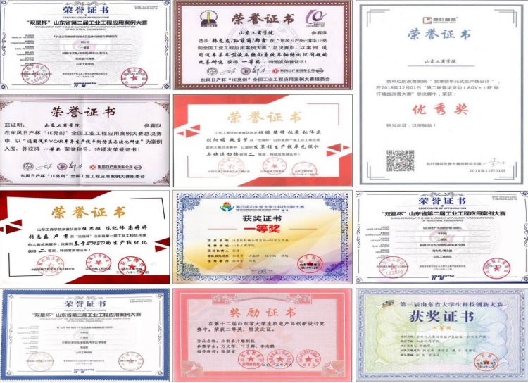 工业工程实验室不仅满足了工业工程类专业实验教学,也为师生科技创新提供了重要平台,切实为提高学生实际动手能力而服务。专业师生获第四届、第六届清华IE亮剑全国工业工程应用案例大赛冠军、山东大学生科技创新大赛一等奖1项、二等奖1项、山东省工业工程应用案例大赛一等奖1项、二等奖6项、国家大学生创新创业大赛及其他各类竞赛奖30项。